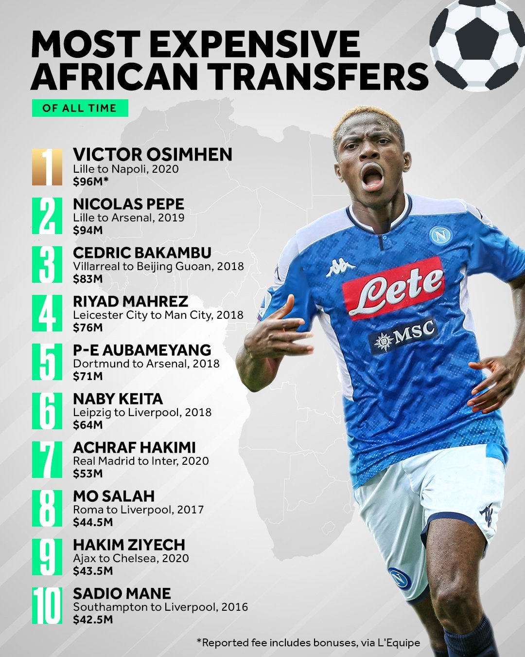 Recent news broke out that Nigerian forward Victor Osimhen has become Napoli’s record signing and Africa’s joint-most expensive player, after his switch from Lille. Now we are going to look at a list of Africa’s most expensive footballers.